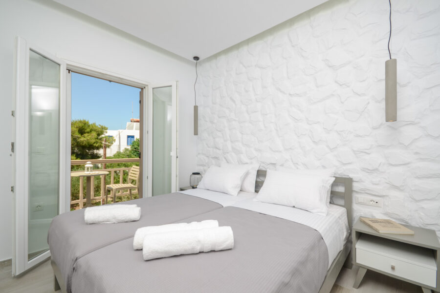 The Junior Apartment is a bright and tastefully designed semi-basement unit, featuring a bedroom, a comfortable living area, and a fully equipped kitchen. It offers all the amenities you need to relax and enjoy the Cycladic sun and the beauty of Naxos. The apartment is fully soundproofed, fitted with safety glass and electric windows. Although it does not include a balcony, it remains airy and filled with natural light.