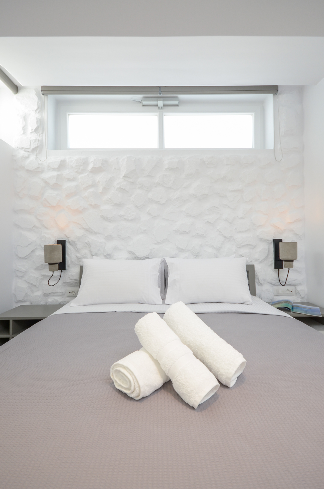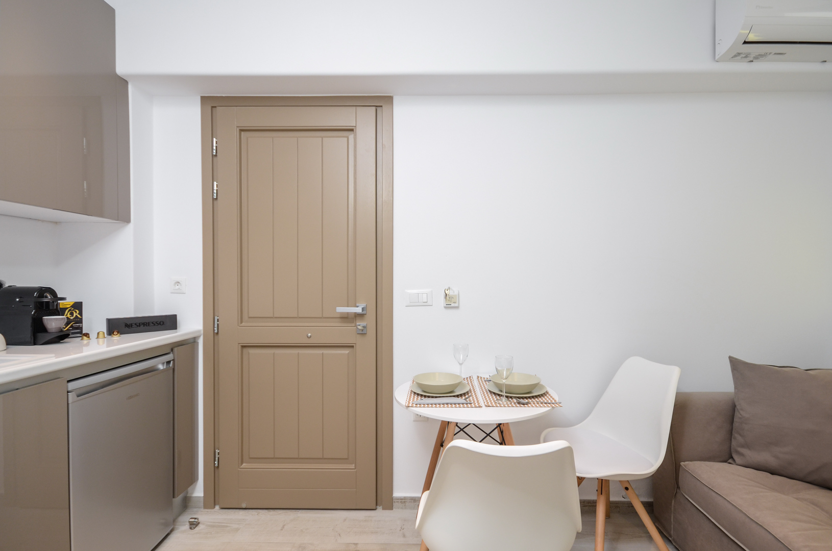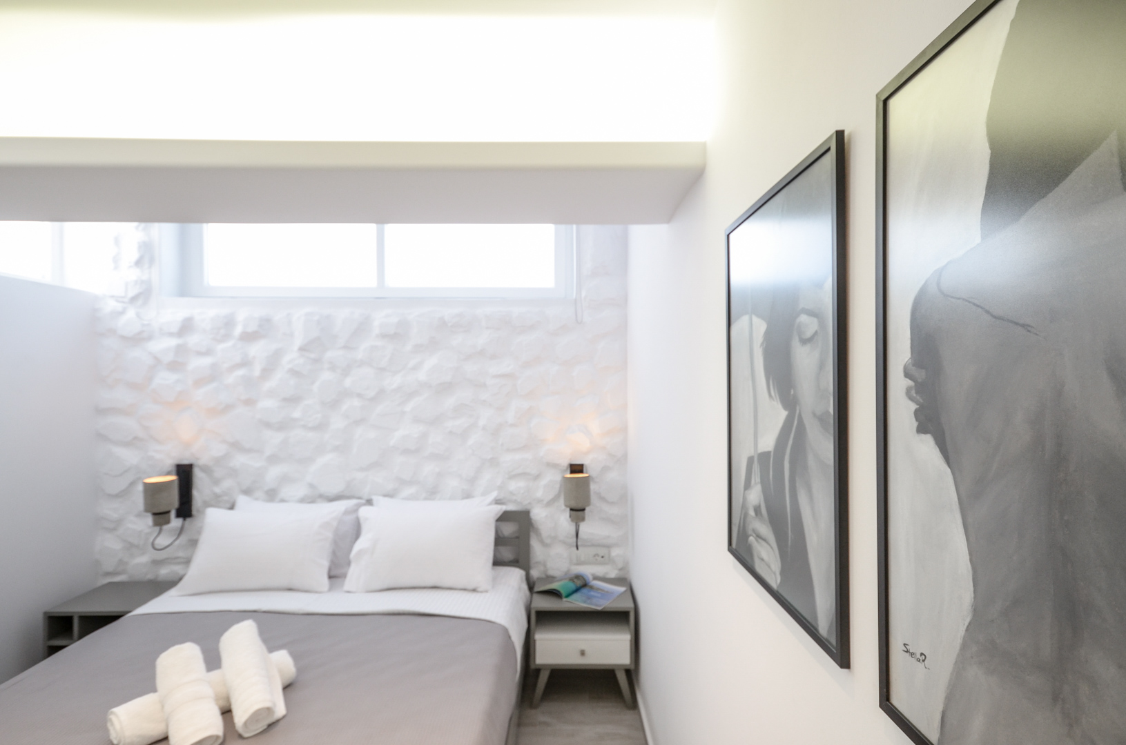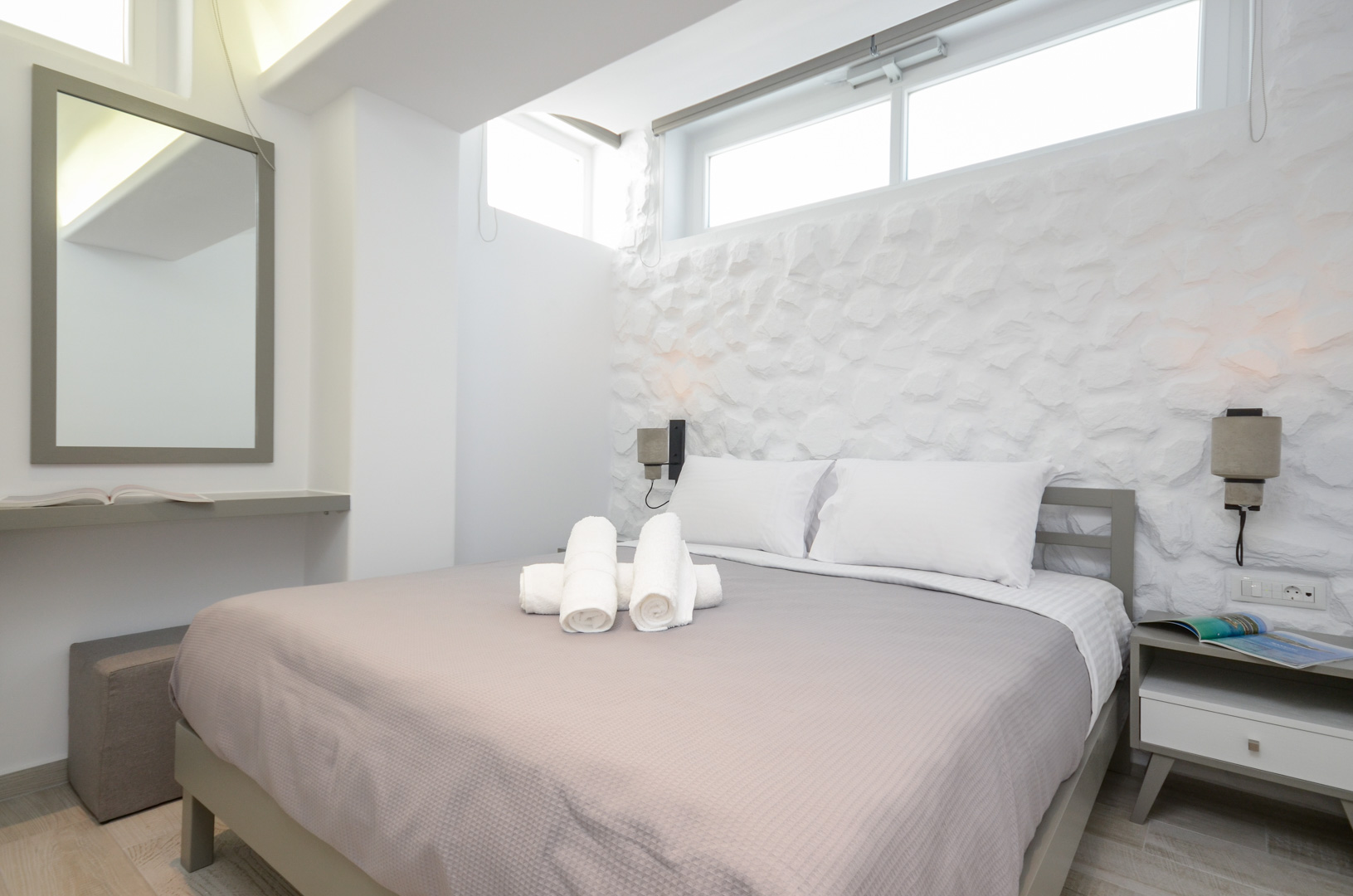 The Junior Apartment is a bright and tastefully designed semi-basement unit, featuring a bedroom, a comfortable living area, and a fully equipped kitchen. It offers all the amenities you need to relax and enjoy the Cycladic sun and the beauty of Naxos. The apartment is fully soundproofed, fitted with safety glass and electric windows. Although it does not include a balcony, it remains airy and filled with natural light.