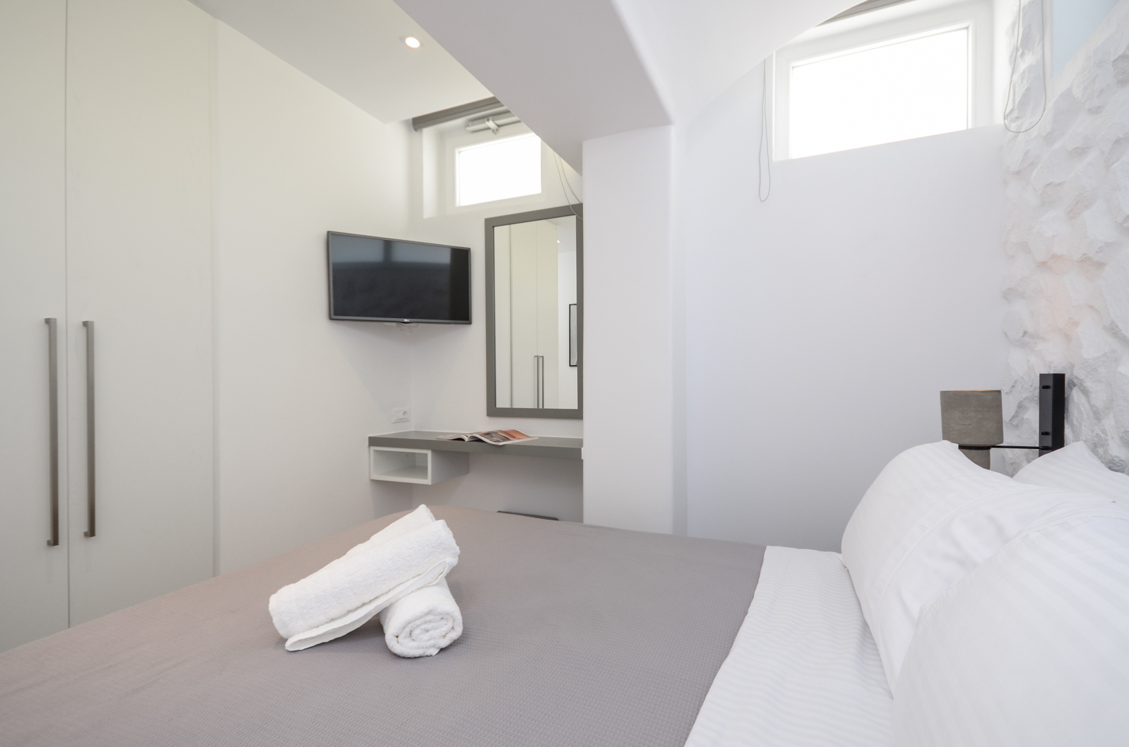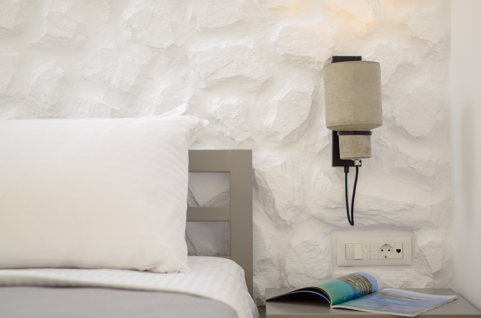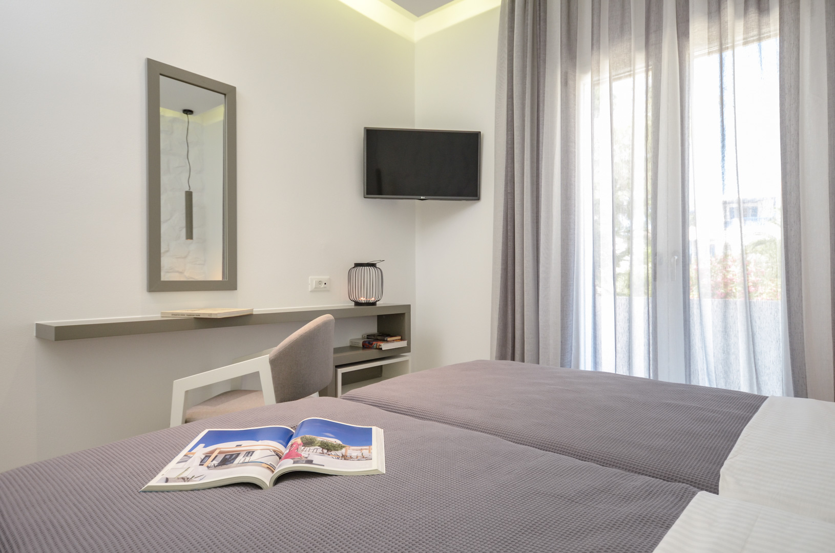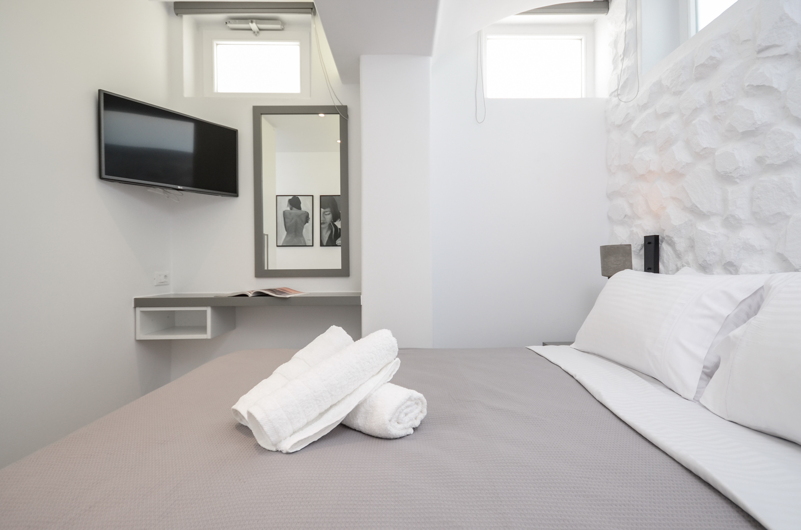 The Junior Apartment is a bright and tastefully designed semi-basement unit, featuring a bedroom, a comfortable living area, and a fully equipped kitchen. It offers all the amenities you need to relax and enjoy the Cycladic sun and the beauty of Naxos. The apartment is fully soundproofed, fitted with safety glass and electric windows. Although it does not include a balcony, it remains airy and filled with natural light.